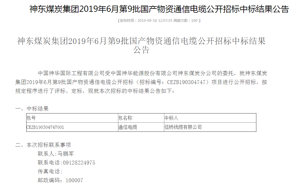點(diǎn)擊數(shù):62842019-11-21 00:00:00 來源: 神東煤炭集團(tuán)2019年6月第9批國產(chǎn)物資通信電纜公開招標(biāo)中標(biāo)結(jié)果公告